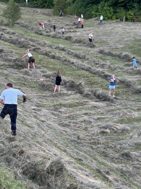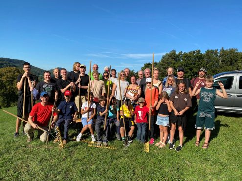 Es trieb einem fast schon die Tränen in die Augen, wie zwei ukrainische Jungs, keine 10 Jahre alt, ihrer Mama bei der Bergwiesenpflege halfen, einen steilen Wegrain hochzukommen. Wie in jedem Jahr machte sich der Metzinger Albverein am vorletzten Septembersamstag wieder auf, die Bergwiese im Gewann Gänsrain vom abgemähten und dürr gewordenen Gras zu befreien. Die Mitarbeiter von Revierförster Jürgen Dufner hatten die Wiese abgemäht, der stellvertretende Vorsitzende der Metzinger Albvereinsortsgruppe, Eckart Ruopp, hatte bei Mitgliedern, Naturschützern und der ukrainischen Community in Metzingen um Helfer geworben. Ziemlich erfolgreich, denn auf der Wiese wuselte es nur so von Jungs, Mädchen und ukrainischen Mamas, die beherzt Rechen und Gabeln in die Hand nahmen und das dürre Mähgut bei herrlichen Wetterbedingungen zusammentrugen, damit es später wiederum vom Forst aufgenommen und abgefahren werden konnte. Fast 35 Helfer waren auf der Wiese im Einsatz, orginäre Albvereinler deutlich in der Minderheit, und erledigten die gestellte Aufgabe im Nu. So musste man sogar noch auf das Vesper in der herrlichen Morgensonne warten und es blieb noch Zeit, sich mit den ukrainischen Helfern sprachlich auszutauschen und herzlich für deren kräftige Unterstützung zu danken. Einige ukrainische Familien nehmen bereits aktiv an den Veranstaltungen der Albvereinsortsgruppe teil, besonders die Aktivitäten der Familiengruppe finden deren Interesse. Am Schluss gelobten alle Helfer: Nächstes Jahr sind wir wieder dabei!