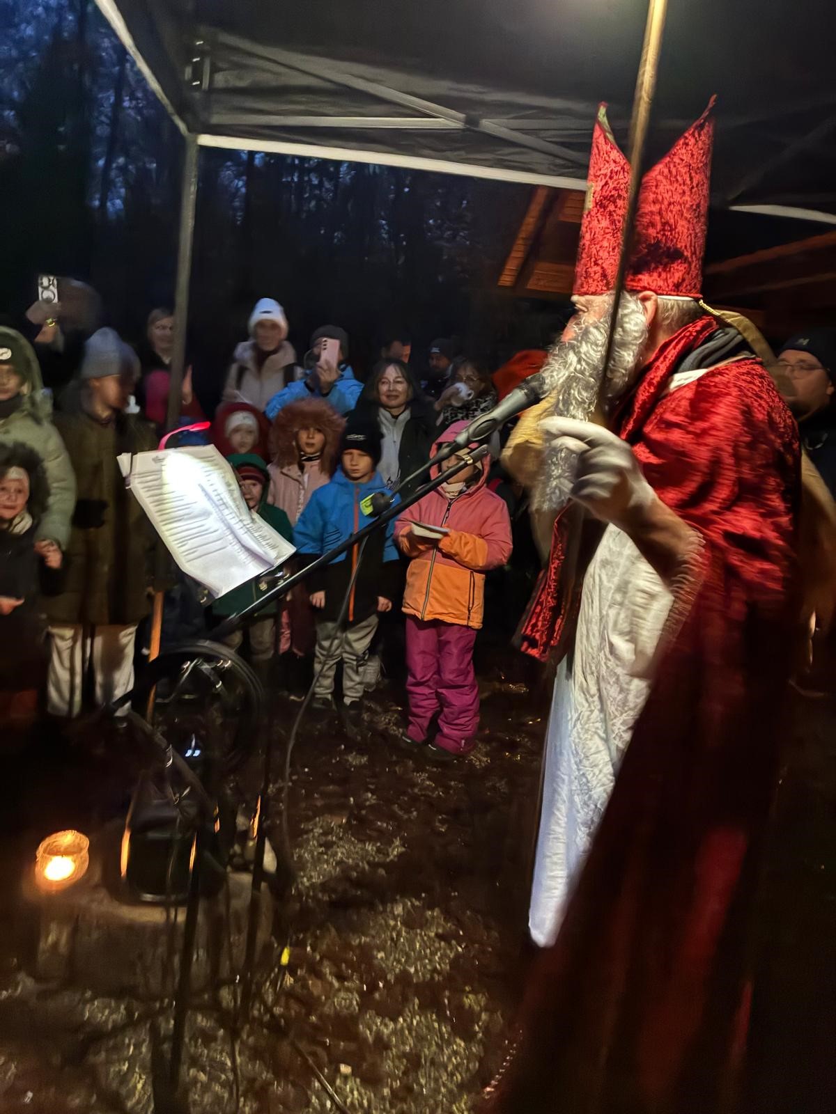 Die Waldweihnacht des Metzinger Albvereins am 1. Advent erfreute sich großer Beliebtheit. Gut 170 große und kleine Teilnehmer hatten sich anmeldet und machten sich am Sonntagnachmittag vom Forsthof aus auf eine von mehreren Wanderungen, die – über kurz oder lang – zur Buchhütte führten. Dort wurden sie mit Kerzenschein, einem prasselnden Lagerfeuer und festlicher Blasmusik empfangen, die Familiengruppe des Albvereins wartete mit Punsch und Glühwein sowie Lebkuchen auf. Im Wald erklangen traditionelle Weihnachtslieder mit Begleitung durch die Blasmusik. Daneben gab auch eine ukrainische Familie ein sehr besinnliches Weihnachtslied aus ihrer Heimat zum Besten. Als der lang erwartete Nikolaus schließlich erschien und alle Kinder mit einem Geschenk aus seinem großen Gabensack erfreute, war die Begeisterung groß. Nach der besinnlichen Zeit am Lagerfeuer machten sich die Eltern und Kinder schließlich mit Fackeln auf den Rückweg zum Forsthof.