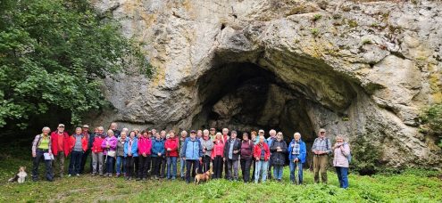 Wie sagt man doch: Es gibt kein schlechtes Wetter, nur die falsche Kleidung! Und so ließ sich keiner der Senioren von der Fahrt nach Bingen abhalten. Kaum war man dort angekommen, stach schon leicht die Sonne durch die Wolken und man musste sich keine Gedanken mehr zum Wetter machen. Start der Wanderung war die Lauchert-Brücke unterhalb Hornstein. Auf ebenem Weg erreichte die Gruppe schon die ersten Felsformationen am Eingang zum Bittelschießer Täle, ein canyonartiges Tal, dessen Bezeichnung auf die Ruine Bittelschieß am Talbeginn zurückgeht. Eine rund zwei Meter hohe künstliche Staukante ist hier im Flussbett zu erkennen, die das Wasser der Lauchert über einen Kanal drei früheren Mühlen zuleitete. Eine schmale Holzbrücke über den Fluss führte die Wanderer weiter zur Bittelschießer Höhle, die mit 15 m Höhe und bis zu 64 m Tiefe beeindruckende Ausmaße erreicht. Von hier führt ein kurzer Anstieg zu einer Kapelle und zu den wenigen Resten der hochmittelalterlichen Burgruine Bittelschieß, erbaut um 1150.